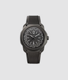 Octo Roma WorldTimer watch with mechanical manufacture movement, automatic winding, 24 time zones, 24-hour indicator, hours, minutes and central seconds, BVL 257 caliber (6.03 mm thick), 42-hour power reserve, 28,800 VpH (4 Hz) frequency. 41 mm sandblasted stainless steel case with black DLC treatment (10.80 mm thick), matte black Clous de Paris dial, polished black brass indexes and satin-polished brass hours and minutes hands with black PVD treatment filled with Super-LumiNova®, polished brass central seconds hand with black PVD treatment, matte brass 24-hour disc with day-night indicator alongside the 24 time zones disc with black PVD treatment and white hours and time zones, sandblasted steel screw-down crown with black DLC treatment set with black ceramic insert, transparent case back, interchangeable black rubber strap and additional black alligator bracelet with sandblasted stainless steel pin buckle with black DLC treatment. Water-resistant up to 100 meters.