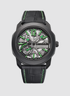 Octo Roma Striking 8 days watch with mechanical manufacture skeletonized movement with manual winding, small seconds and power reserve indication, BVL 199SK caliber (2.5 mm thick), 192-hour (8-day) power reserve, frequency 21'600 VpH (3Hz). 44 mm sandblasted titanium case (9.1 mm thick) with black DLC treatment, polished sapphire middle case, sandblasted black bezel ring with seconds counter, power reserve indication and indexes with black PVD treatment filled with green Super-LumiNova®, white timer, polished brass hour and minute arrow hands with black PVD treatment and green Super-LumiNova®, sandblasted brass second arrow hands with green PVD treatment and green Super-LumiNova®, sandblasted titanium crown with black DLC treatment and black ceramic insert, transparent caseback, interchangeable black rubber strap with green stitches and additional black alligator bracelet with sandblasted titanium and stainless steel folding buckle with black DLC treatment. Water-resistant up to 30 meters.
