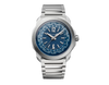 Octo Roma WorldTimer watch with mechanical manufacture movement, automatic winding, 24 time zones, 24-hour indicator, hours, minutes and central seconds, BVL 257 caliber (6.03 mm thick), 42-hour power reserve, 28,800 VpH (4 Hz) frequency. 41 mm satin-polished stainless steel case (10.80 mm thick), matte blue Clous de Paris dial, polished rhodium-plated finish brass indexes and satin-polished rhodium-plated hours and minutes hands filled with Super-LumiNova®, polished rhodium-plated brass central seconds hand, matte brass 24-hour disc with day-night indicator alongside the 24 time zones disc with cities with blue ALD treatment and white hours and time zones, polished steel screw-down crown set with black ceramic insert, transparent case back, interchangeable satin-polished stainless steel bracelet with folding buckle and additional blue rubber strap with satin-polished stainless steel pin buckle. Water-resistant up to 100 meters.