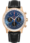43.00 mm rose gold case, 14.22 mm thick, sapphire crystal back, non screw-locked crown with two gaskets, bidirectional bezel with slide rule, cambered sapphire crystal with glareproof treatment on both sides, blue dial, Breitling 01 self-winding movement with date in dial aperture and chronograph function, approximately 70 hours of power reserve, black croco strap, tang buckle. Water resistant to 3 bars.