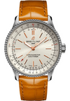 35.00 mm stainless steel case, 9.92 mm thick, non screw-locked crown with two gaskets, bidirectional slide rule bezel, cambered sapphire crystal with glareproof treatment on both sides, silver dial, Breitling 17 self-winding movement, approximately approx. 38 hrs of power reserve, gold brown alligator leather strap, folding buckle. Water resistant to 3 bars.