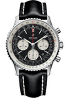 43.00 mm steel case, 14.22 mm thick, sapphire crystal back, non screw-locked crown with two gaskets, bidirectional bezel with slide rule, cambered sapphire crystal with glareproof treatment on both sides, black dial, Breitling 01 self-winding movement with date in dial aperture and chronograph function, approximately 70 hours of power reserve, black leather strap, tang buckle. Water resistant to 3 bars.