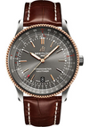 41.0 mm stainless steel and 18K red gold case, 10.0 mm thick, non screw-locked crown with two gaskets, bidirectional slide rule bezel, anthracite dial, Breitling 17 self-winding movement, approximately approx. 38 hrs of power reserve, brown alligator leather strap, folding buckle. Water resistant to 3 bars.