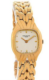 The Patek Philippe Vintage Ladies 18k Gold Quartz Watch, Model Number 4715/1, crafted in 1989, epitomizes timeless elegance. Encased in its original Patek 18k yellow gold cushion case measuring 20.0 x 20.0 mm, this watch exudes sophistication. Its #1.604.248 Quartz movement, with 6 jewels and Caliber E15, ensures precision timekeeping. The off-white dial, adorned with twisted baton hands, adds a touch of refinement. Paired with its original Patek 18k yellow gold integrated bracelet, this watch is in great condition, embodying both luxury and durability. Complete with its original Patek box and papers, it represents a quintessential piece of horological craftsmanship, backed by its 100% authenticity with triple sign.