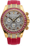 Rolex Yellow Gold Daytona Watch - Off-Catalogue - 40 MM - Diamond Paved Dial - Pink Leather Bracelet - Pink Sapphire Bezel - 116598SARO