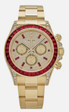 The Off-Catalog Rolex Daytona 126598TRU is a dazzling interpretation of the iconic chronograph, blending luxury and performance in an unforgettable design. The 18k yellow gold case, measuring 40mm, exudes opulence, while the ruby-set bezel adds vibrant color and a sense of exclusivity.