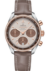 38 mm stainless steel and 18K rose gold case, dual bezel with a tachymeter scale on a brown aluminium ring while the outside is diamond-paved, scratch-resistant sapphire crystal anti-reflective treatment on both sides, cappuccino dial includes horizontal brown oval subdials and a vertical oval date window at 6 o’clock, tachymeter scale, Caliber Omega 3330 self winding movement with chronograph, chronometer, date, approximately 52 hours of power reserve, taupe-brown leather strap. Water resistant to 10 bar (100 metres / 330 feet).