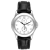 The Patek Philippe Calatrava Travel Time White Gold Men's Watch 5134G is a refined timepiece designed for precision and style. It features a manual winding movement with 18 jewels and a caliber of 215/156. Encased in a 37.0 mm diameter 18k white gold case with protective shoulders and a screw-down sapphire crystal case back, this watch is both elegant and durable. The off-white dial is complemented by applied white gold Arabic numeral hour markers, a small seconds sub-dial at 6 o'clock, and a 24-hour sub-dial at 12 o'clock, adding functionality to its aesthetic appeal. The watch comes with a black leather strap and a white gold deployant buckle for a secure and comfortable fit. It is in excellent condition and is authenticated as 100% genuine, making it a timeless addition to any watch collection.