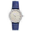 Presenting the elegant Patek Philippe Calatrava White Gold Cream Dial Diamond Ladies Watch, model number 7120G, designed to captivate with its timeless beauty and precision craftsmanship. This exquisite timepiece features a manual-winding movement driven by the esteemed Calibre 215 PS, housed within a 31.0 mm diameter 18k white gold case, accentuated by an exhibition transparent sapphire crystal case back. Adorning the bezel is a stunning 18k white gold Patek factory diamond bezel, adding a touch of luxury and sophistication. The cream guilloche dial exudes refined charm, adorned with gold baton hour markers and dauphine hands, with a small seconds sub-dial delicately positioned at 6 o'clock. Completing the ensemble is a stylish blue leather strap, secured with an 18K white gold tang buckle. Despite its opulent appearance, this watch maintains its practicality, evidenced by its excellent condition and precise timekeeping, verified through meticulous testing on a Witschi watch expert timing machine. While a hairline scratch on the crystal adds character, it does not detract from the watch's overall allure. Accompanied by a Patek pouch, rest assured of its authenticity, making it a prized possession for discerning collectors and enthusiasts alike.