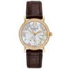 The Patek Philippe Calatrava Yellow Gold MOP Diamond Ladies Watch 4959J is a luxurious timepiece designed for elegance and precision. This watch features a manual-winding movement and is housed in an exquisite 18k yellow gold case with a diameter of 31.0 mm, showcasing an exhibition case back for a glimpse of the intricate movement. The bezel is adorned with dazzling diamonds, adding a touch of sophistication. The dial is adorned with a silver engine-turned design, a mother-of-pearl chapter ring, raised gold Arabic numerals, and diamond hour markers, creating a stunning visual contrast.