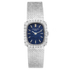 The Patek Philippe 18k White Gold Diamond Bezel Cocktail Ladies Watch (Model 4102) embodies timeless elegance and sophistication. Designed for ladies, this exquisite timepiece features a manual winding movement housed within an 18k white gold cushion case measuring 22 x 18 mm, with the iconic Patek logo adorning the crown. Enhancing its allure, the watch boasts an original Patek factory diamond bezel, adding a touch of luxury and sparkle. The scratch-resistant sapphire crystal with a flat profile safeguards the vibrant blue texture dial, accented by white baton hour markers and complemented by white pointed baton hands. Its 18k white gold integrated textured bracelet with a locking clasp offers both style and security, comfortably fitting a 6" wrist. Presented in great vintage condition, this timepiece exudes charm and sophistication, further validated by its 100% authenticity. While accompanied by a presentation non-Patek box, its strong and accurate timekeeping reaffirms its quality and reliability, making it a cherished addition to any collection.