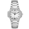 The Patek Philippe Nautilus Silver Dial Diamond Steel Ladies Watch 7018/1A-001 is a stunning timepiece that combines elegance with functionality. Its model number is 7018/1A-001, and the serial number is 575xxxx, indicating its production year as 2014. Designed for ladies, this watch features an automatic self-winding movement with 29 jewels and operates on the caliber 324 C S, showcasing Patek Philippe's expertise in horological engineering.
