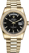 This Rolex Day-Date Automatic Watch boasts a striking Black Dial with Diamonds set on the Bezel, adding a touch of luxury. The timepiece features practical Day and Date functionalities, powered by the reliable self-winding automatic movement (Caliber 3155). Encased in lustrous yellow gold, both the bracelet and case contribute to the watch's timeless elegance.