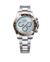 40mm platinum case, screw-down back, screw-down crown with triplock triple waterproofness system, chestnut brown monobloc cerachrom bezel in ceramic with moulded numerals and graduations, scratch-resistant sapphire crystal scratch-resistant sapphire, ice blue dial, diamond-set baguette hour markers, 4131, manufacture Rolex perpetual, mechanical chronograph, self-winding movement with centre hour and minute hands, small seconds hand at 6 o'clock, chronograph via centre seconds hand, 30-minute counter at 3 o'clock and 12-hour counter at 9 o'clock, stop seconds for exact time setting, approximately 72 hours of power reserve, Oyster bracelet with three-piece solid links, folding Oysterlock safety buckle with Easylink 5mm comfort extension link. Waterproof to 100 metres / 330 feet.